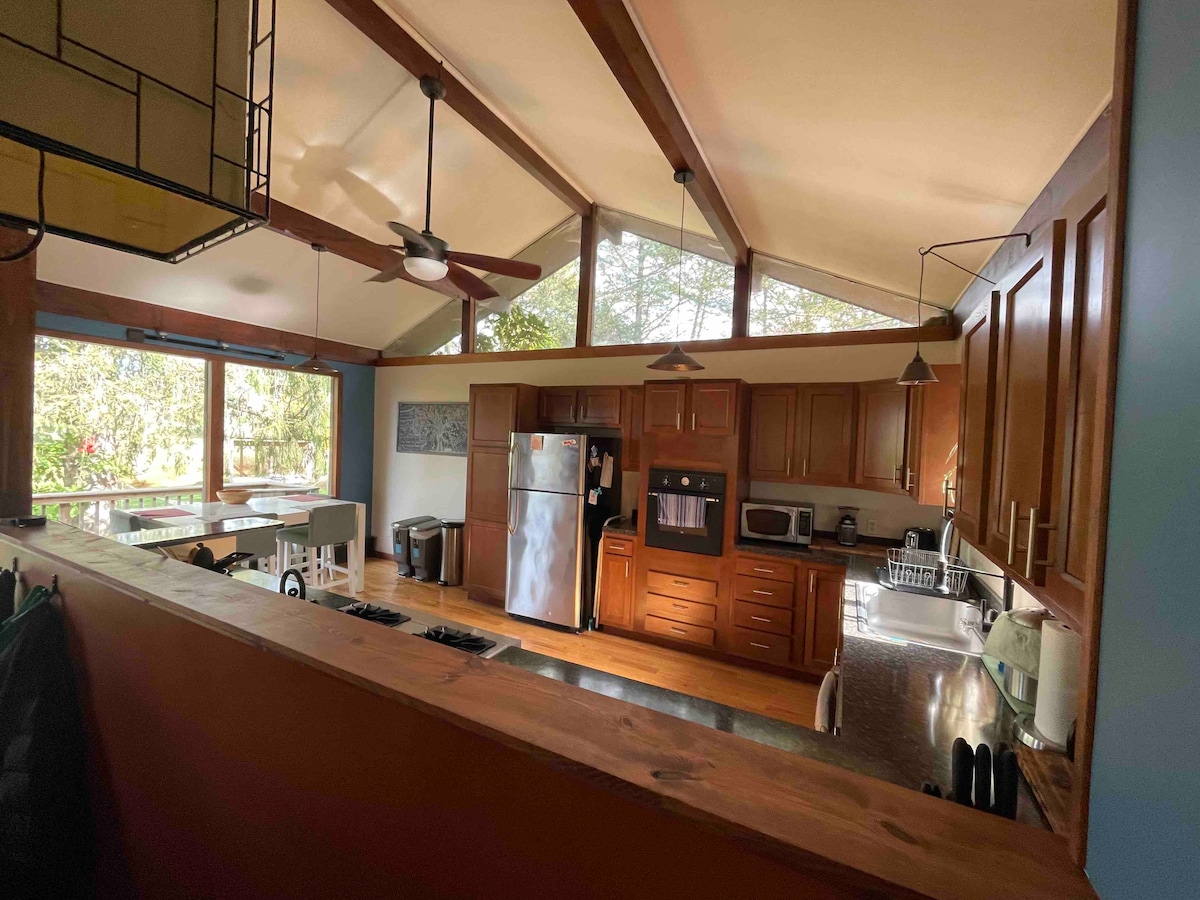 Take a leisurely walk under the towering trees in the quiet wooded acre surrounding our cozy, alpine-inspired cabin with contemporary bohemian touches. Sleep in upstairs under deep-set skylights, observe wildlife out our large picture windows, or curl up by the fire on the rustic screened porch. Daydream on our hammock or dine alfresco taking advantage of our barbeque. On a clear night, it is easy to stargaze up through the tall trees, perhaps while toasting marshmallows fireside.