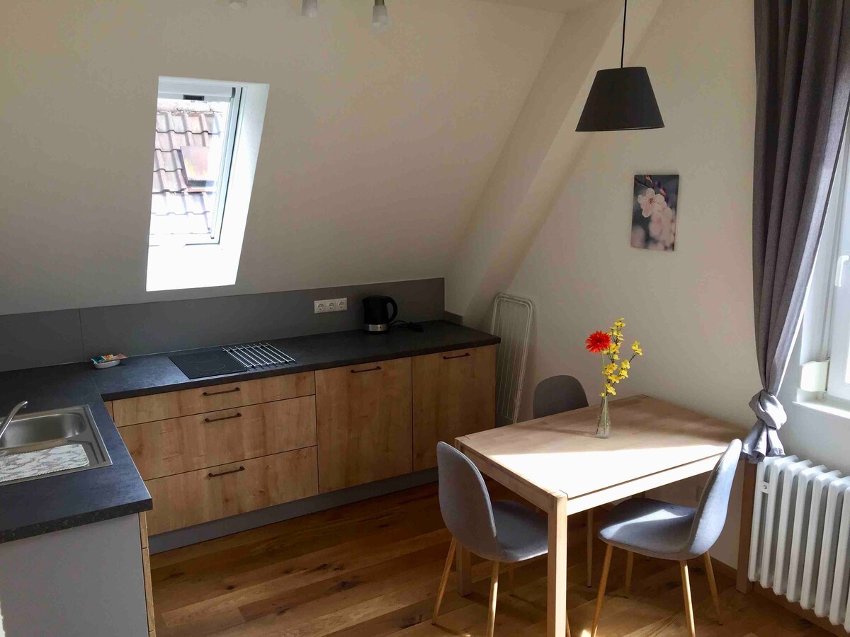 Apartamentul mobilat cu drag se află într-o casă înregistrată din perioada Gründerzeit din mansardă, în centrul orașului Creglingen ( 17 km până la Rothenburg). Casa aparține brutăriei noastre. Există o cafenea la parter, unde poți lua și micul dejun. Se pot adăuga biciclete ( incluse). După consultare, oaspeții sunt bineveniți să se uite la brutărie. Apartamentul, bucătăria și baia sunt dotate cu tot ce ai nevoie. Fără animale de companie