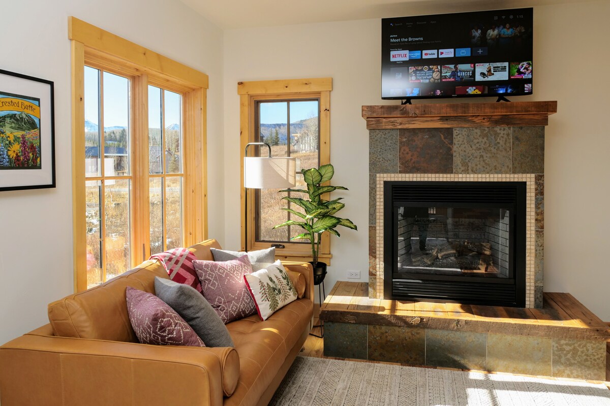 Această unitate de colț cu două etaje, două dormitoare și două băi poate găzdui până la 6 oaspeți și se simte mai mult ca o locuință decât o casă în oraș sau un apartament în complex rezidențial. Spațiul privat oferă priveliști frumoase, orientate spre vest, spre orașul Crested Butte de mai jos, Oh Be Joyful Range, Muntele Emmons și Red Lady Bowl. Ferestre imense, o terasă scăldată de soare cu scaune de schi Adirondack de casă vara și toamna, un gazon privat și un șemineu confortabil cu gaz - locul perfect pentru après ski cu prietenii și familia. Apusurile de soare sunt spectaculoase.