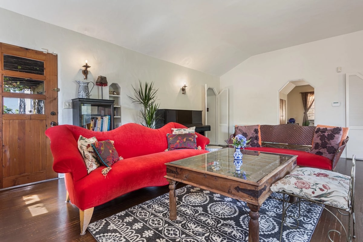Casă mare liniștită, recent mobilată, + refugiu în grădină în Culver City Arts District. Casă de vacanță perfectă pentru familii mici, cu birou de acasă. Mergi pe jos până la Jerry's Market, Destroyer, Bianca's Bakery, Platform, Ivy Station și Helms Bakery. 1 pat king-size și 1 pat dublu pot găzdui maxim 4 adulți. 6 mile până la UCLA. Lângă Apple, Warner, Amazon, Downtown Culver, Expo Light Rail, autostrada I-10. Ai nevoie de ceva mai mic? Consultă Black & Gold Guesthouse în profilul meu. Ne vedem în curând! Janis