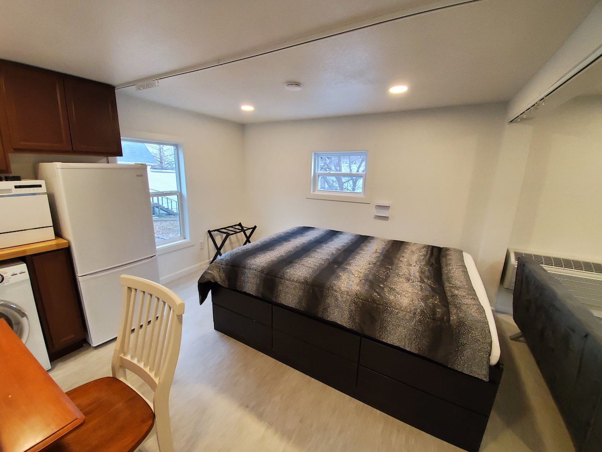 situat la 2 străzi de centrul orașului, în spatele casei noastre renovate din 1906 American Foursquare, acest studio de 480 de metri pătrați este gata să te ajute să te instalezi! Remodelat în vara anului 2019! Pat matrimonial și saltea gonflabilă disponibile. BRAND NOU în acest an este terenul comun de murături/tenis/baschet, care este privat pentru oaspeții, prietenii noștri și pentru noi! Curtea cu gazon este liberă să o folosească și ea! Contactează-mă dacă ai vreo întrebare