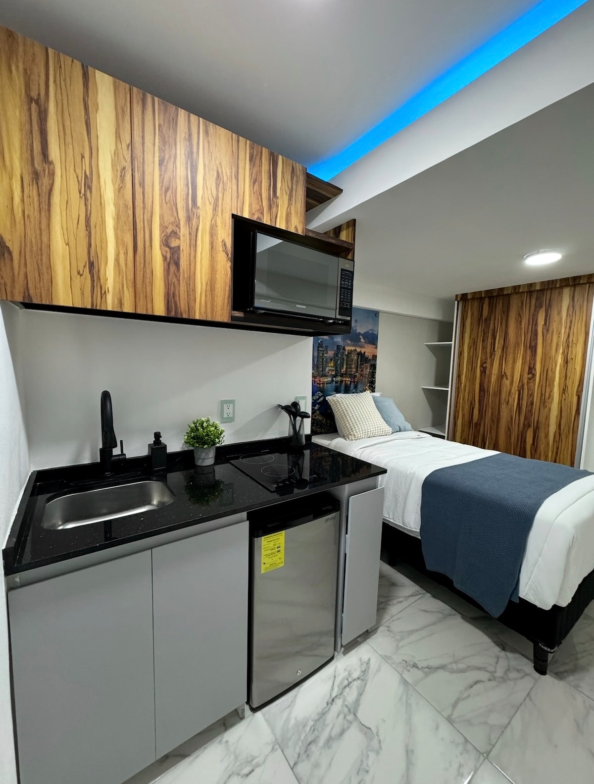 Estudio de 33m2, ideal para un viaje corto a la zona de Santa Fe, cuenta con 1 cama king, smart tv, barra de servicios (microondas), smart tv con internet y baño propio. El espacio lo recomiendo para viajeros que buscan pocas noches de hospedaje. Limpieza diaria y 1 cajón de estacionamiento incluido. **El espacio no se compate con nadie*** **Edificio con seguridad y recepción 24/7**