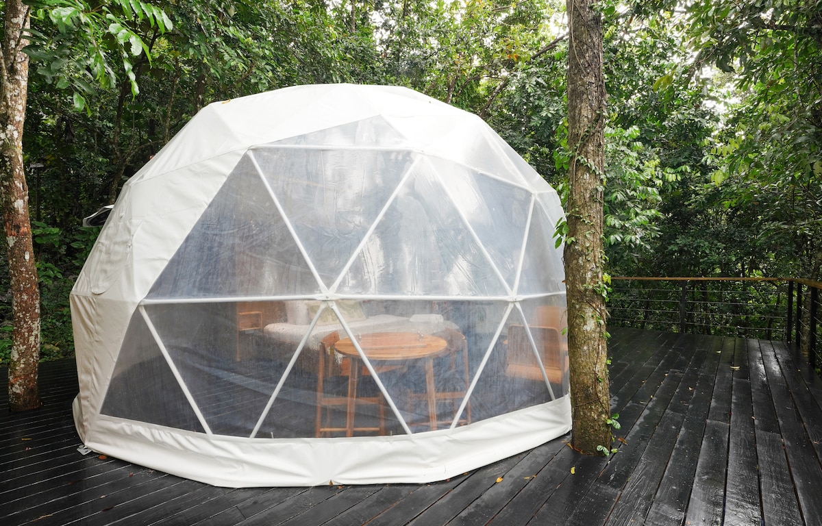 Te invitamos a hacer una pausa y a crear memorias. Te imaginas dormir en un Domo Geodésico transparente en un bosque privado de 10,000 m2 con veredas privadas que te llevarán al Río Cubuy en donde podrás bañarte en piscinas naturales y cascadas durante toda tu estadía. Te invitamos a dormir en una Selva Tropical en la zona de El Yunque con todas las comodidades a solo 35 minutos del Viejo San Juan y a 30 minutos del Balneario de Luquillo. Tour virtual 360 incluido en las fotos QR CODE.