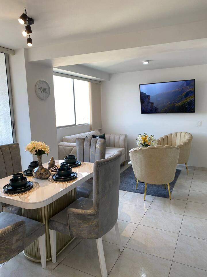 Apartamentul este confortabil, economic, iar clădirea este exclusivă. Indiferent dacă vii singur@, cu prietenii sau familia, suntem aproape de tot atunci când stai în acest spațiu situat central. În ceea ce privește cazarea, are două dormitoare cu pat dublu și un pat de o persoană în unul dintre ele, unde îți poți caza întregul grup, înregistrat în mod corespunzător. Clădirea are planuri pentru ca tu să stai în ea toată ziua, cum ar fi: să stai în piscină pentru o vreme, să mergi la săli de sport sau să urci pe terasă.
