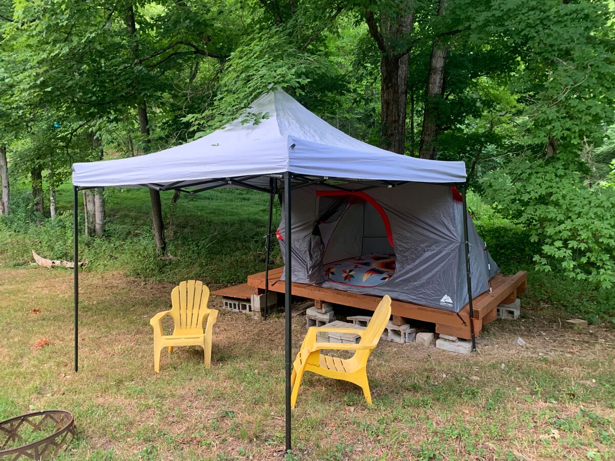 Cortul nostru, Hazel, este la 20 de picioare, pe o platformă de terasă și este amplasat în pădure în micul nostru camping privat și la fermă. Complet cu un pat matrimonial și o canapea extensibilă care se dublează ca opțiune de dormit twin; acest cort poate găzdui până la o petrecere de 5 persoane spațioasă. Neelectric, dar îți oferă confortul și elementele esențiale pentru camping în toate anotimpurile! Aproape de duș și de toalete. Oferă o șansă de a te deconecta și de a te relaxa la doar 25 de minute de Nashville. Camping de lux la cel mai înalt nivel!