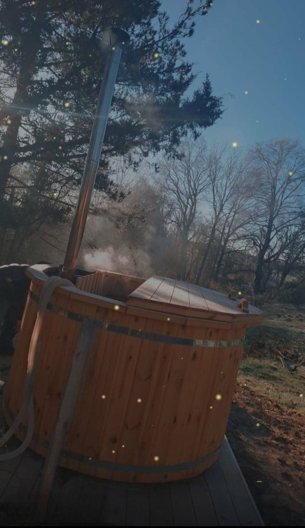 Sur une grande parcelle pour plus d'intimité, une tente de 20 M2 décorée dans un esprit zen et romantique. Jacuzzi privatif sur votre terrasse. Pour une expérience inoubliable, un braséro face au paysage champêtre pour faire griller des chamallows ( offerts) et vivre un moment romantique devant un feu sous les étoiles. Toilettes sèches sur emplacement. Salle d'eau privative à 40 mètres de la tente. Frigo avec soft drink offert. Petit déjeuner, linge de lit et de toilette, ménage sont compris