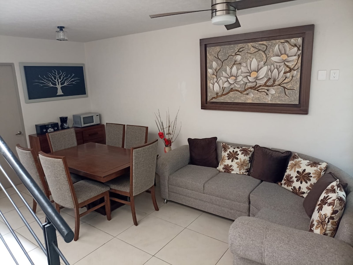 Bucură-te de un apartament modern în exclusivista colonie Lomas Santa Maria, Morelia. Are două camere (un pat matrimonial și două paturi de o persoană), trei băi și jumătate, bucătărie echipată cu aragaz, cafetieră și cuptor cu microunde. În plus, vei avea un garaj privat, mașină de spălat și uscător automat de rufe pentru confort. Situat într-o zonă liniștită, la doar 15 minute de centrul istoric. Aproape de spitale, școli și mall-uri. Ideal pentru familii sau grupuri care caută confort și stil.