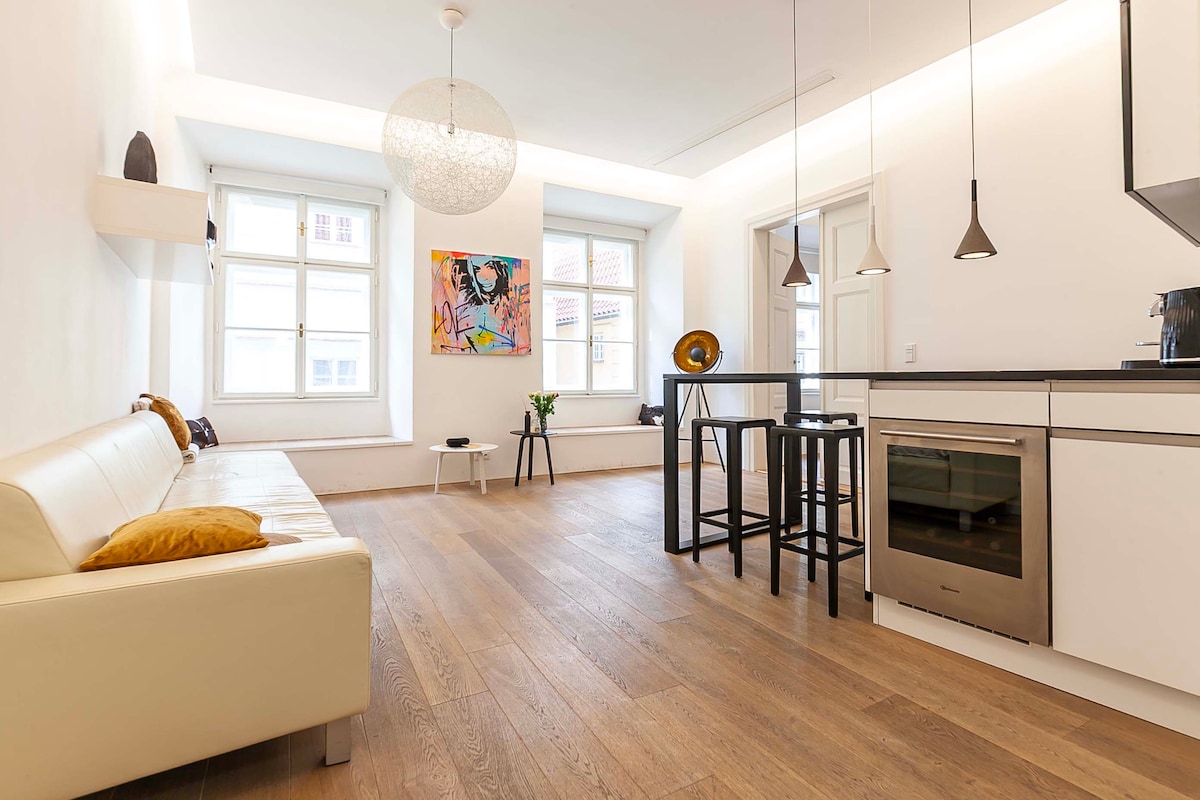 Un apartament frumos reconstruit cu două dormitoare într-o clădire din secolul al XVI-lea, apartamentul este la doar câteva minute minunate de mers pe jos de unele dintre cele mai interesante situri din Praga, inclusiv Castelul și Podul Charles. Ziduri de bolovani, lumini de gaz, străzi întortocheate te vor fermeca. Ferestrele adânci și pereții groși contribuie la romantismul străvechi al acestui apartament. Priveliștile uimitoare ale podului Charles din dormitor și castel din living își vor lăsa amprenta mult timp după plecarea ta.