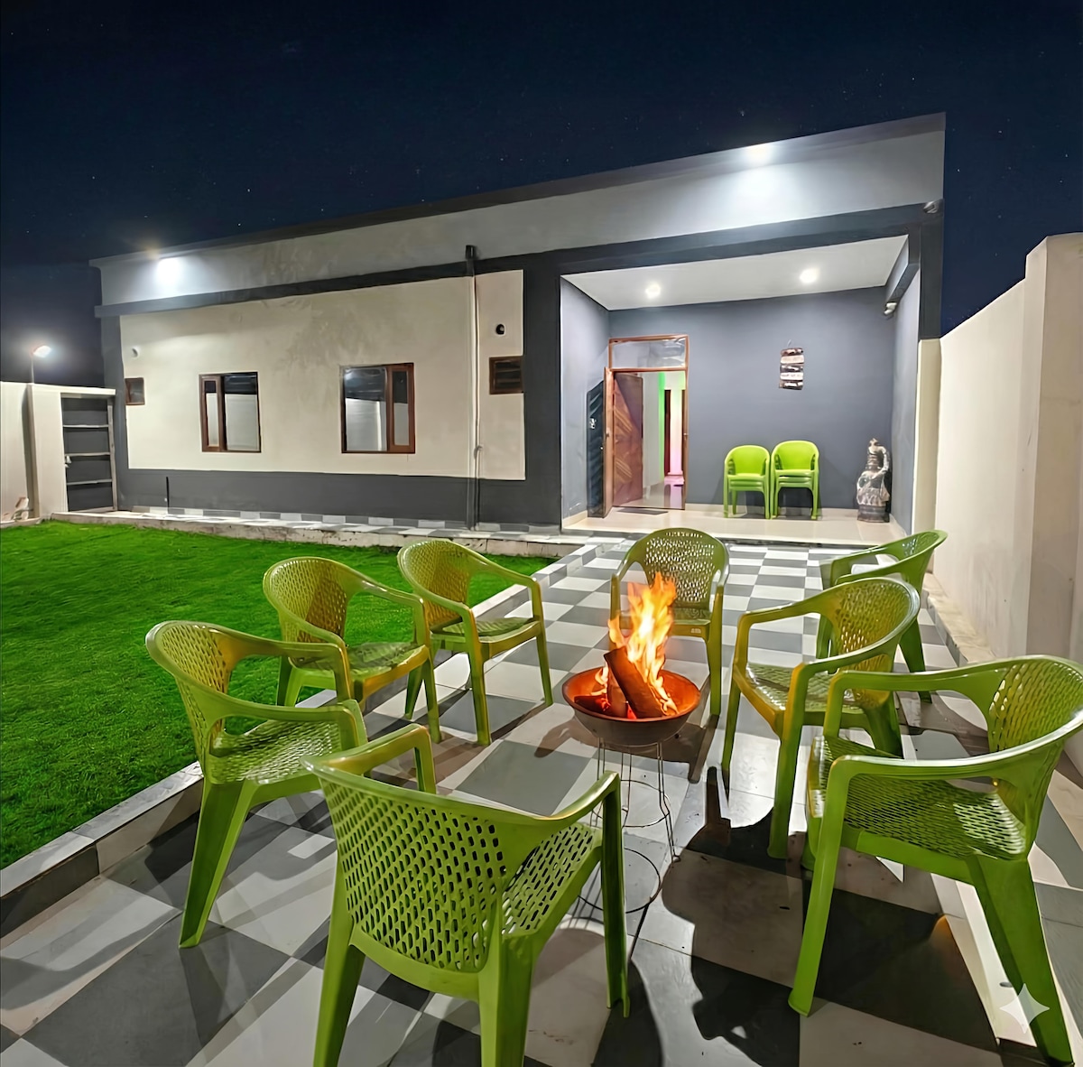 Relaxează-te și revigorează-te cu priveliștea de la piscină/fântână, Grădină cu palmieri, vedere la răsărit de la camere, grădină Zen pentru meditație și yoga. Șederea cuprinde : 2 camere cu băi atașate, sală de servicii cu toaletă, spațiu de spălătorie acoperit și bucătărie modulară de 100 de metri pătrați, împreună cu electrocasnice de ultimă generație. Toate dotările sunt acoperite sub o suprafață de 5000 mp. Grădină verde luxuriantă înconjurată de potecă special concepută pentru a activa punctele de presopunctură și leagănul din lemn. Terasă la StarGaze. Conectivitate la metrou și cafenea