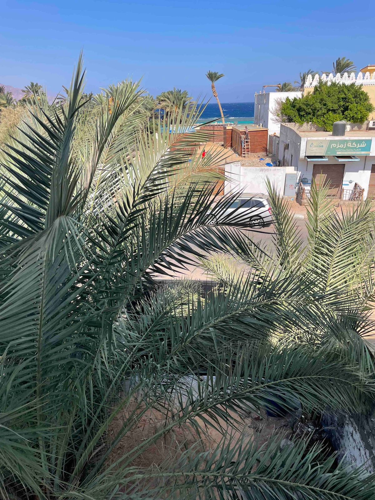 acoperișul se află într-una dintre cele mai frumoase zone din dahab, lângă plajă, este înconjurat de palmieri și verdeață. Încă ai vedere la mare din față, iar priveliștea munților de la fereastra bucătăriei este un cartier foarte confortabil și cald, astfel încât ești la 30 de secunde de mare. lângă restaurantul Seaduction și la 2 minute de piețe. Frarmacy și magazine. Acoperișul este nou. și când este vântos, poți vedea kitesurferii jucându-se în mare, este o experiență minunată!!!