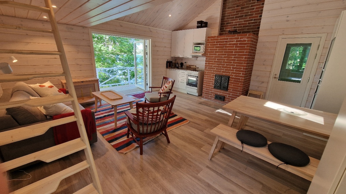 Completed in summer 2024, our cottage with has car access. A Cozy cottage with a small loft and a spacious sauna, as well as a large terrace in front of the house. Good pier for boat access and a small sandy beach for swimming. You can also take a dip in the water from the pier via a swimming ladder. There is an outhouse next to the house. The sauna has very beautiful views of the beach and the sea. A very nice small and cozy archipelago cottage.