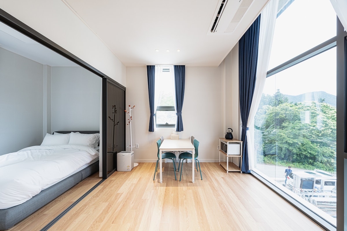 Bună seara! Aceasta este o cazare confortabilă recomandată călătorilor din Damyang:) Această cazare este situată în apropiere de strada Damyang Noodle și poate găzdui până la 4 persoane. Lenjeria de pat suplimentară (saltea superioară, plapumă + pernă) este furnizată pentru 3 sau mai multe persoane. La toate atracțiile turistice din apropiere se poate ajunge pe jos, așa că durează aproximativ 3 minute de mers pe jos până la strada Noodle, 8 minute până la Gwanbangjerim și 10 minute până la Juknokwon. Cafenelele și magazinele de cartier se află la mică distanță, ceea ce îl face ușor de utilizat. Este disponibilă parcare gratuită în parcarea publică de pe strada Noodle, la mai puțin de 1 minut de mers pe jos atunci când folosești propria mașină.