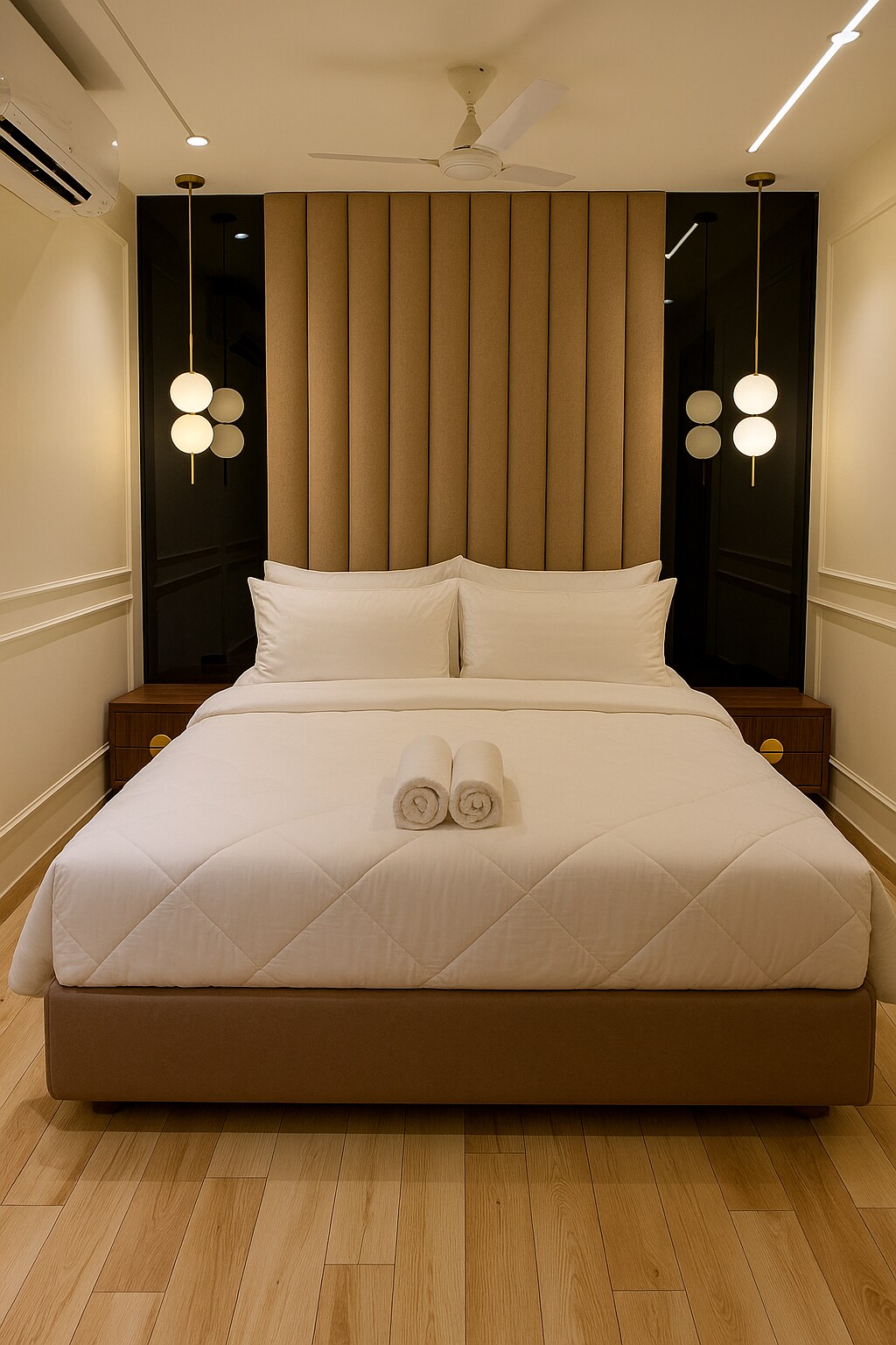 Premium 4BHK apartment in a top-tier society, ideal for groups up to 10. It has 3 double beds for 6 guests and 2 double-bed floor mattresses for 4 extra guests. Located on the 11th floor with great views, lush greenery, and access to amenities like gym, park, swimming pool, covered parking, and 5 lifts. Fully furnished for a comfortable and homely stay.