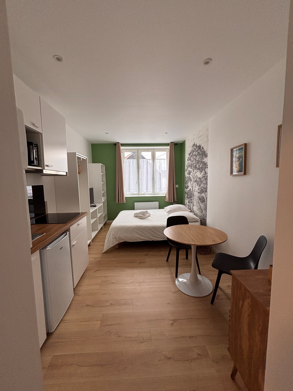 Apartament situat în inima orașului Landerneau, aproape de biroul turistic, podul locuit, toate magazinele locale. 2 pași de gară și 15 minute de mers cu mașina până la aeroportul Brest. 36 m2. Parter cu un dormitor pentru 2 persoane, duș, toaletă, bucătărie utilată, living cu canapea extensibilă de calitate, curte în aer liber. Construită pe plăci de beton, clădirea este foarte bine izolată fonic. Apartament ideal pentru o escală în North Finistere. Cea mai apropiată plajă este la 20 de minute distanță
