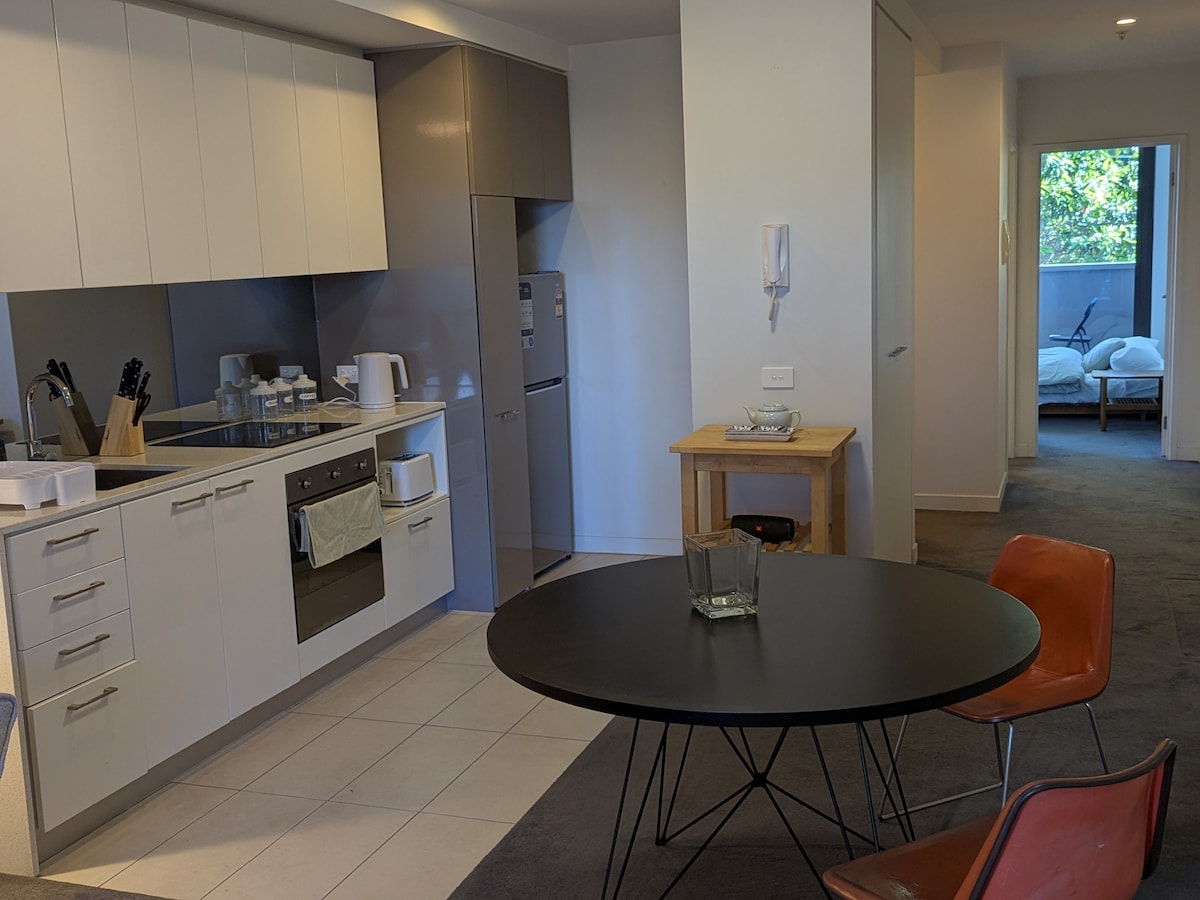 Relaxează-te într-un apartament elegant, plin de artă, din Brunswick East, perfect pentru cupluri sau persoane care călătoresc în interes de afaceri. Bucură-te de patul matrimonial de lux, de balconul cu frunze sau lucrează la biroul încorporat. Gătește în bucătăria modernă sau ia o cafea de la aparatul DeLonghi Nespresso. Mașina de spălat și uscătorul fac viața departe de casă ușoară. Mergi pe jos până la cafenele, baruri și parcuri sau ia tramvaiul, situat chiar în fața ușii din față, până la CBD și ajungi acolo în 15 minute. Confort, design și farmec Melbourne, toate într-un singur spațiu primitor.