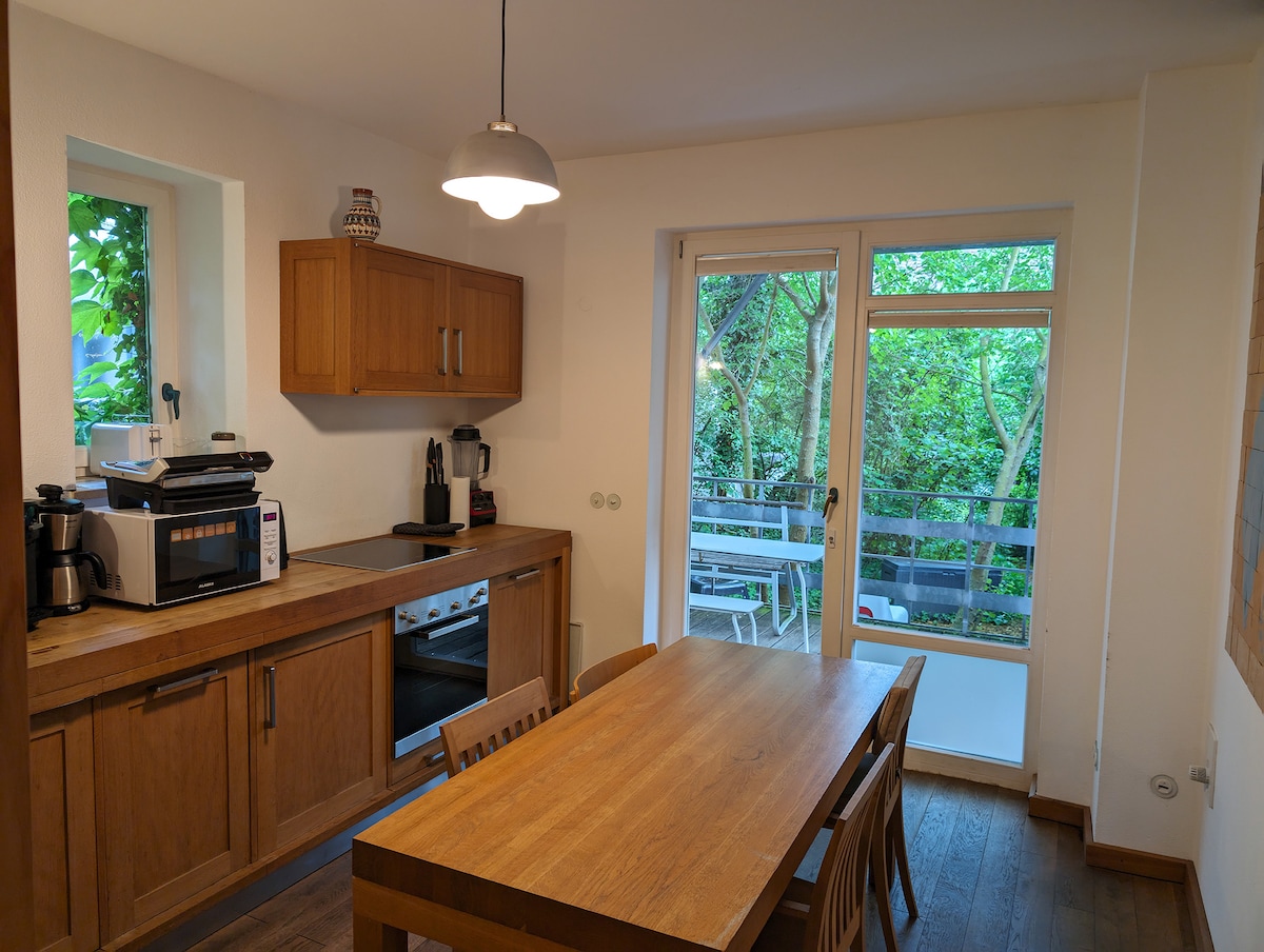 Atelierul Galerie Blau de aproximativ 28 m² a fost transformat într-un apartament confortabil în stil duplex, cu o intrare separată și o terasă mică în grădină. În zona superioară se află nivelul de dormit și de lucru cu un pat dublu de 180 x 200 m. La parter se află zona de luat masa cu o chicinetă și o canapea, care poate fi pliată într-o canapea extensibilă, dacă este necesar. Chiar lângă ea este camera de duș mică. O mașină de spălat este, de asemenea, la dispoziția ta.
