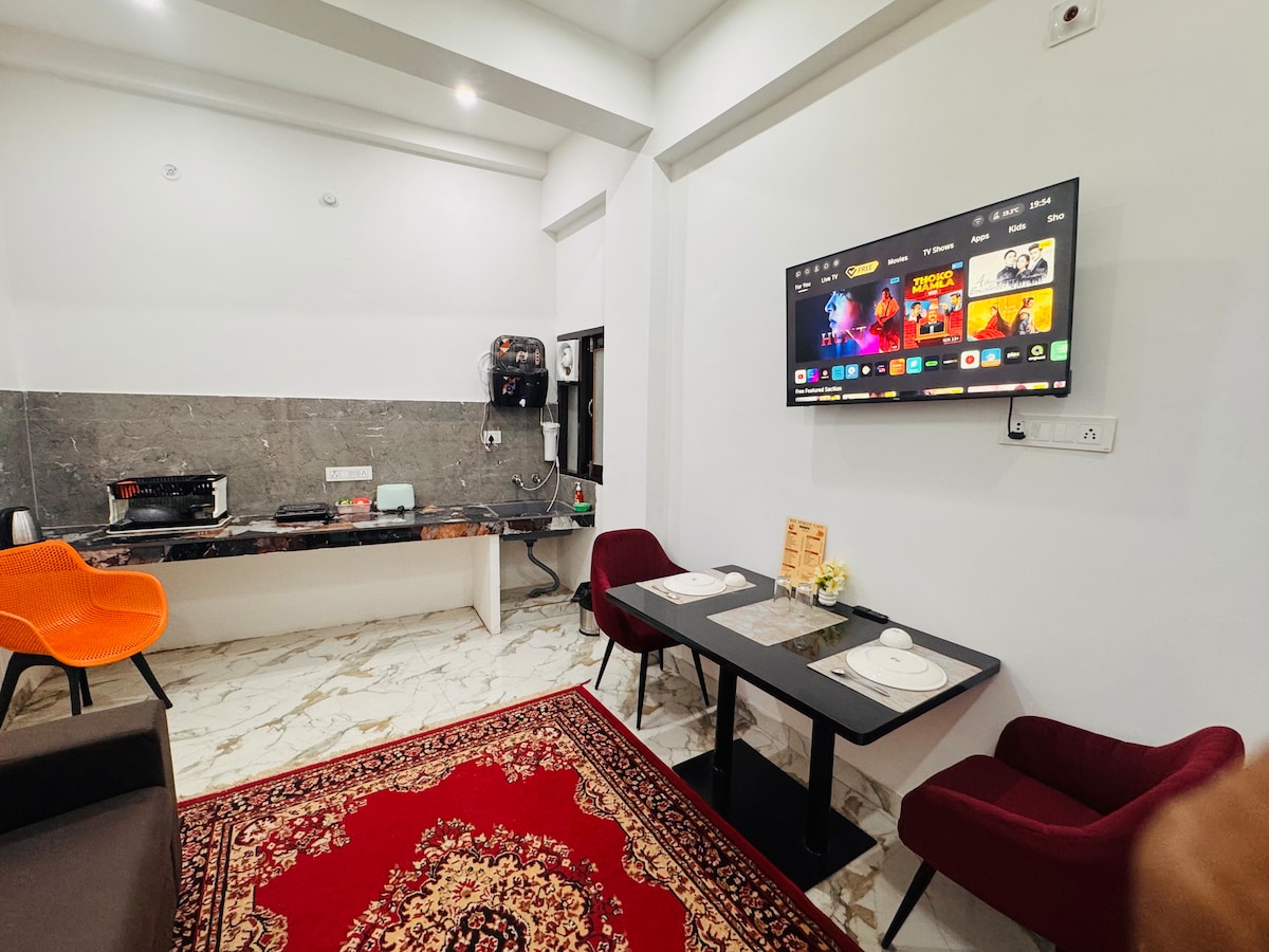 #Premium 2BHK (NUMAI FAMILII) #Sosiți și relaxați-vă cu familia într-un loc absolut henic și securizat #Proprietatea are lift și alimentare de rezervă cu parcare # Templul Kashi Viswanath la doar 2,5 km, Dashashwamedh Ghat - 3 km # Canapea extensibilă convertibilă în living #Masă pentru servit masa #Holul are aer condiționat separat și Smart TV, ambele dormitoare (fereastră AC) # Bucătărie modernă complet utilată pentru gătit (include ceainic electric,inducție, prăjitor de pâine, frigider, coș de fum, filtru de apă #Uscător de păr,fier de călcat, mașină de spălat,Gyser