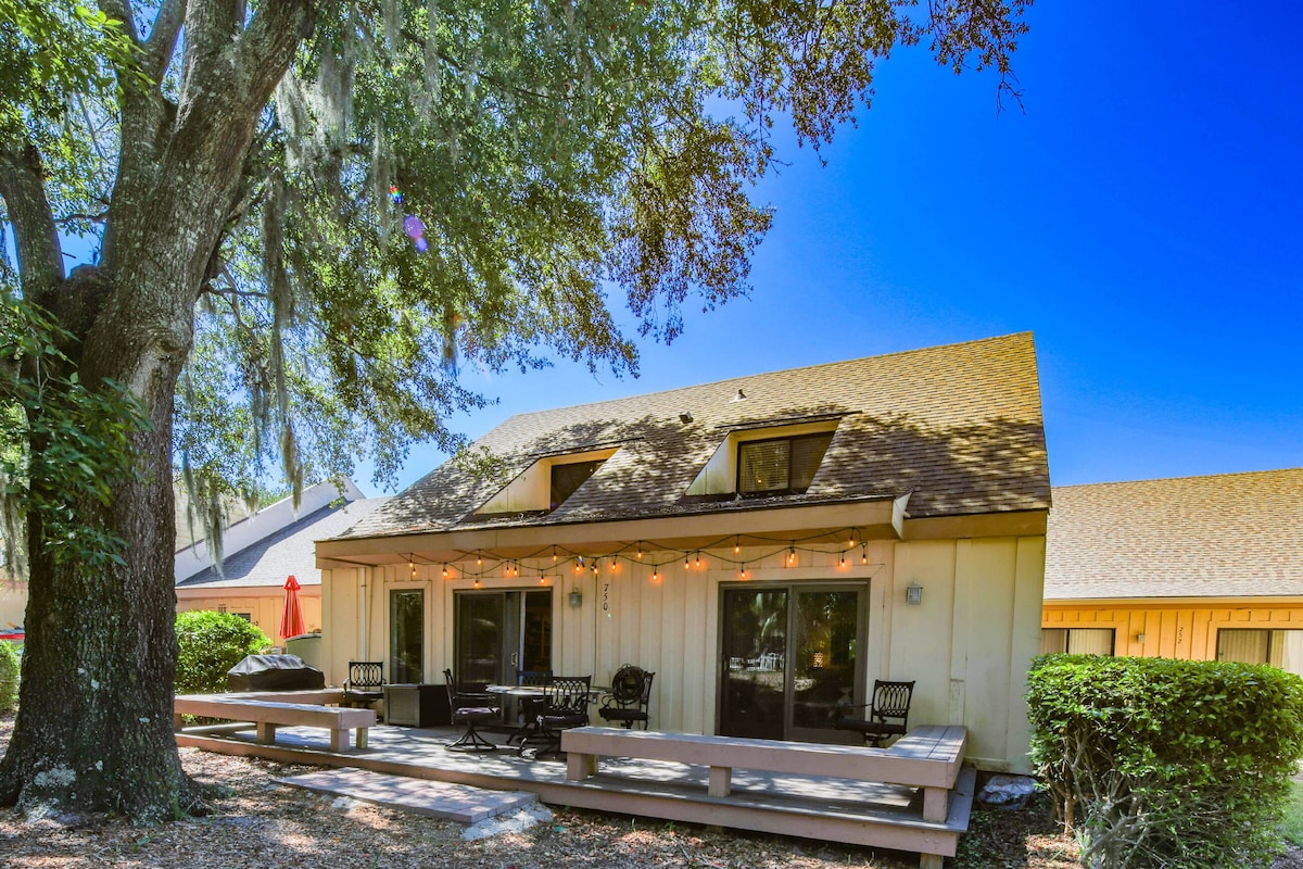 5-10 minute walk to the pristine Hilton Head beach, retreat to your spacious villa in Queen's Grant of Palmetto Dunes. With nearly 1500sq ft and lofted ceilings, you can spread out comfortably. New living room furniture that all reclines, amazing king green tea memory foam mattress in both bedrooms, and a fully stocked kitchen (blender, toaster oven, crock pot+.) The master and living room open up to a private back patio equipped with a grill, dining room table and beach accessories.