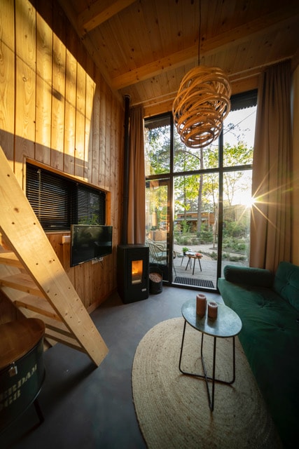 Cabană în pădure pe Veluwe cu sobă pe lemne.