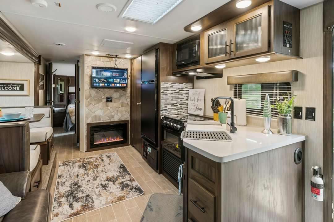 Fantastic acasă departe de casă. Bucură-te de liniștea exterioară,precum și de un somn confortabil. Există 2 Smart TV-uri în interior de care să te bucuri. Rulota are Wi-Fi. Gătește înăuntru sau fă grătar afară cu grătarul portabil cu cărbuni. Cărbunele și lichidul de brichetă sunt furnizate. Radio Bluetooth. Rulota este echipată cu farfurii, aparat de cafea,castroane,căni și ustensile. Scaunele sunt în compartimentul de depozitare exterior pentru a te bucura de șederea afară sub noua copertină de 20 ft. Duș interior și exterior. 2 galoane de gaz pot fi la bordul rulotei.