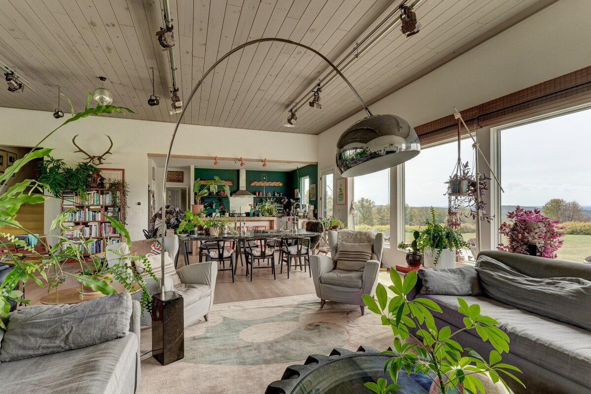 A modern 3BR/2BA Catskills retreat on 6 private acres with a hot-tub, and fireplace. Perched on a hill, this single-level home offers serenity, scenic views, mid-century modern decor, and comfort—ideal for girls' trips, couples and families. Amenities: Fireplace Hot Tub Spa Mini Ping-Pong Dart Board High-speed Wi-Fi Narrowsburg Offers: -Restaurants & Shops -Luxury Spas & Yoga -Alpaca Farm -Hiking -Farmer's Markets -Delaware Valley Arts Alliance Experience the best of the Catskills!