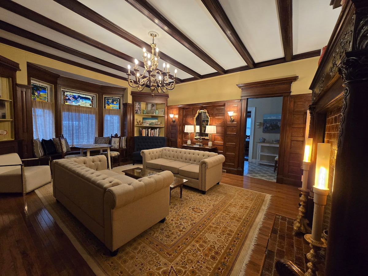 Bine ai venit la Mansion Suite, o bijuterie istorică recent renovată în inima Pieței Centru. Printr-o intrare privată, în josul unui foaier lung, vei descoperi marea cameră Oak, o sufragerie expansivă cu șemineu dramatic, lambriuri, tavan cu grinzi, vitralii. Adiacent lounge-ului, este o bucătărie elegantă și complet utilată, cu aparate noi din oțel inoxidabil. Ambele dormitoare au paturi matrimoniale noi, tâmplărie naturală frumoasă și au vedere la o curte privată și liniștită.