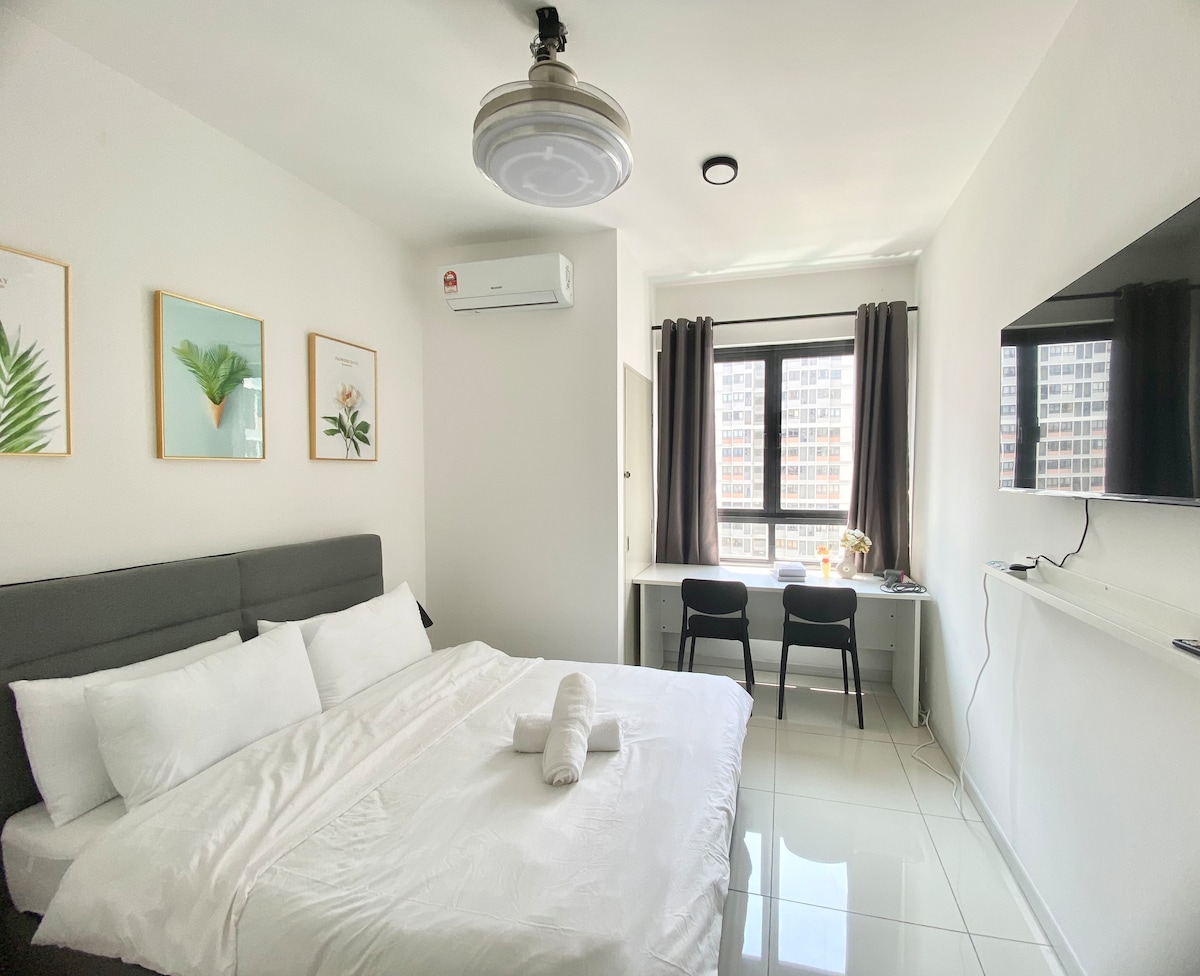 Explorează studioul nostru confortabil, care poate găzdui 2 până la 3 persoane cu un pat matrimonial și o canapea extensibilă. La doar 15 minute de mers cu mașina de KLIA T1/T2, locul este înconjurat de multe restaurante, sucursale de fast-food, alimente și spălătorii, toate la câțiva pași. Savurează toate facilitățile, inclusiv locul de joacă pentru copii, zona de grătar, sala de gimnastică și piscina, cu securitate non-stop. * Nu este disponibilă, lasă-ți bagajele înainte de check-in. Din cauza clădirii proiectate, trebuie să urci 10 trepte pentru a obține liftul.