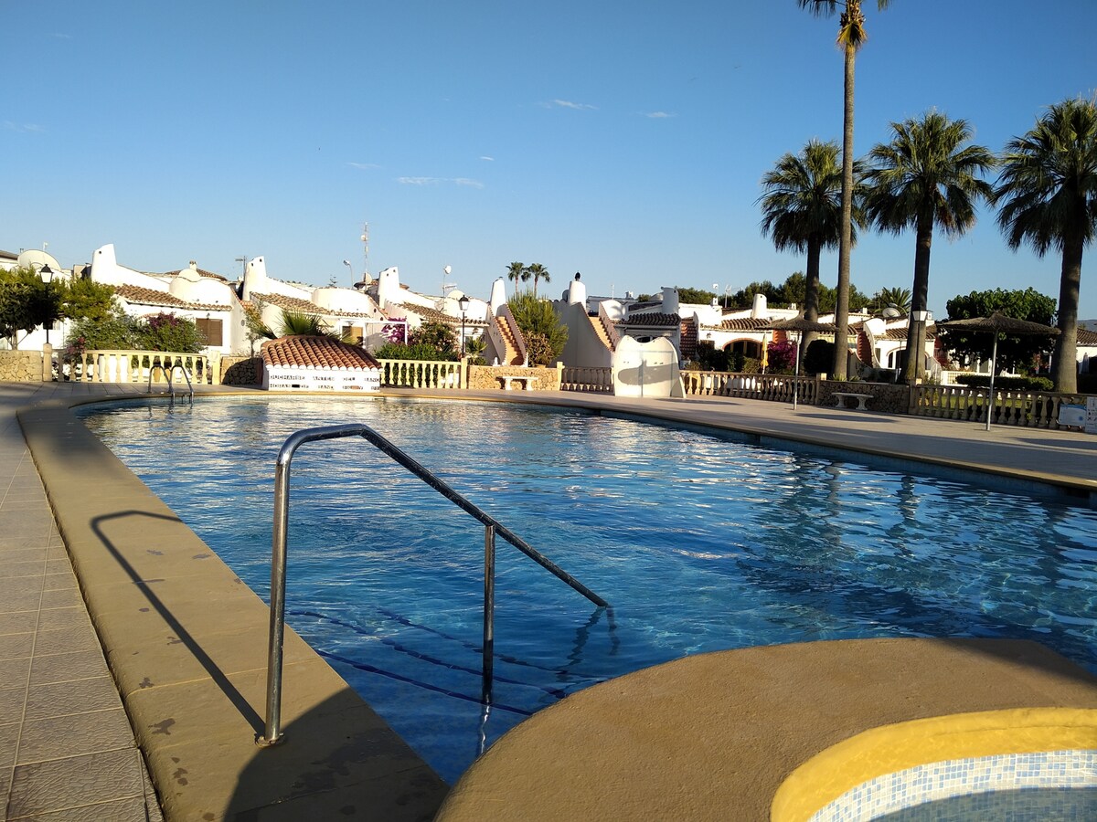 Bungalou cu grătar și grădină mică, ideal pentru animalele de companie. Are 2 dormitoare, un pat dublu și un pat de o persoană. Baie cu duș, living-sufragerie, bucătărie utilată, mașină de spălat vase, cuptor și mașină de spălat rufe. Are o piscină comunitară, WIFI (600 MB), aer condiționat și căldură. Satélite TV (Astra 1, 2 și Hotbird) (ENG, IT, International) La 5 km de Benidorm, parcare ușoară, zonă și dezvoltare liniștită la 20 de minute de mers pe jos de plaja Albir. Animalele de companie sunt acceptate.