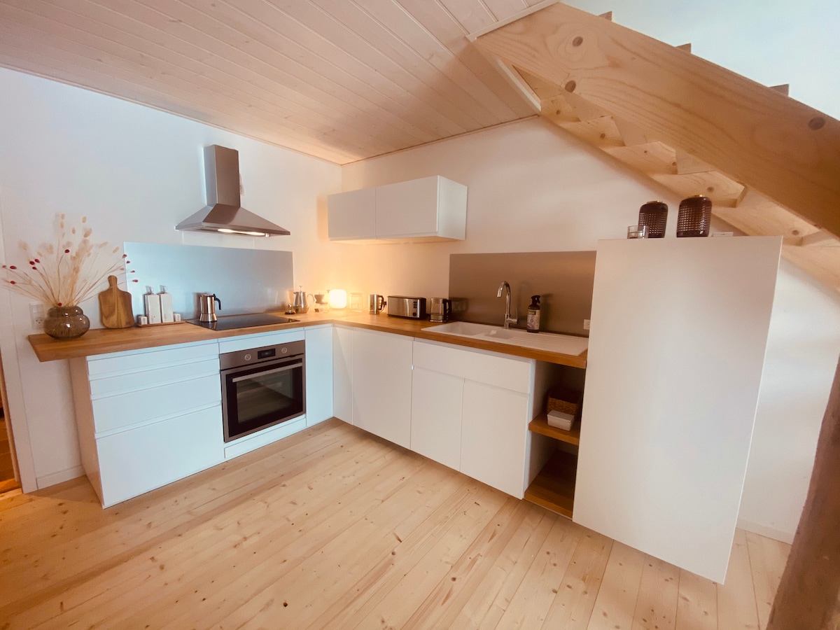 Newly built two-story apartment in our 200-year-old barn, formerly used for cattle, a henhouse, and a carpentry workshop. Perfect for young couples and families with children seeking peace in scenic surroundings. Vittens Længe beach is within walking distance, ideal for relaxation. The stay includes a DIY breakfast with sourdough rolls, butter, jam, milk,eggs from our hens, and nourishing porridge – ideal for an authentic and relaxing getaway close to nature.