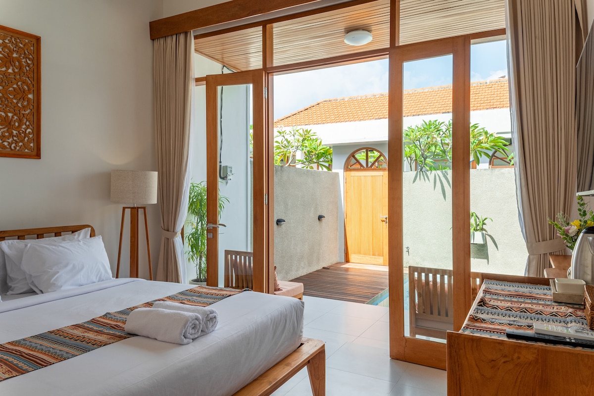 Treziți-vă la priveliștea grădinii noastre tropicale, în timp ce deschideți ușile de sticlă pentru a întâmpina briza dimineții. Bucură-te de micul dejun în zona de living în aer liber și de lounge lângă piscină pentru a te bucura de soare. La ce să te aștepți: 2BR cu baie proprie/living în aer liber cu bucătărie utilată /piscină privată cu terasă și șezlonguri /fibră optică de mare viteză Wi-Fi / curățenie 6 zile pe săptămână / situat într-un cartier rezidențial liniștit din Seminyak /servicii de concierge, asistență și asistență 24-7 și multe altele.