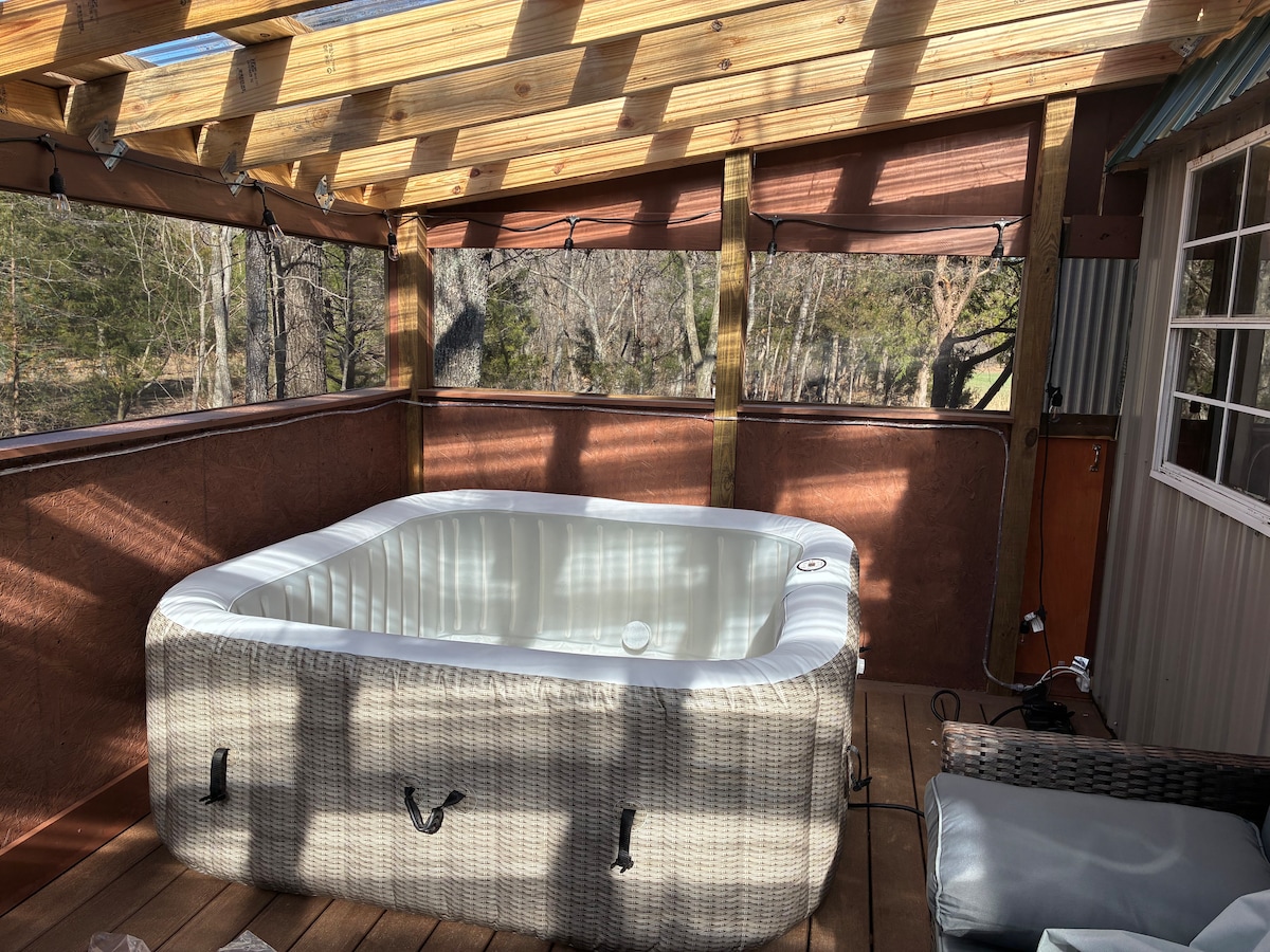 Let your adventure begin inside the tranquil experience of this 20 ft yurt. Don't let the space fool you, the uniquely curved walls give ample space for a romantic getaway or a relaxing time with friends. The clear dome top provides a magical viewing experience from the queen size bed. The yurt is nestled in the heart of the Ozark Mountains. The expansive, romantically lighted, wrap-around deck provides a panoramic view of the St. Francis River where you can immerse yourself in the hot tub.
