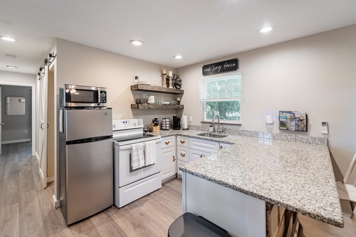 This fully ADA-compliant, cozy cabin offers all the comforts of home in a peaceful RV community. Unwind in our heated pool and hot tub, or enjoy a friendly game of billiards in the clubhouse. Stay active with access to pickleball courts, shuffleboard, and horseshoes, or relax with a good book from our library. Bring your furry —our community features two dog parks for their enjoyment. For added convenience, the living room includes a queen-size sleeper sofa, perfect for guests.