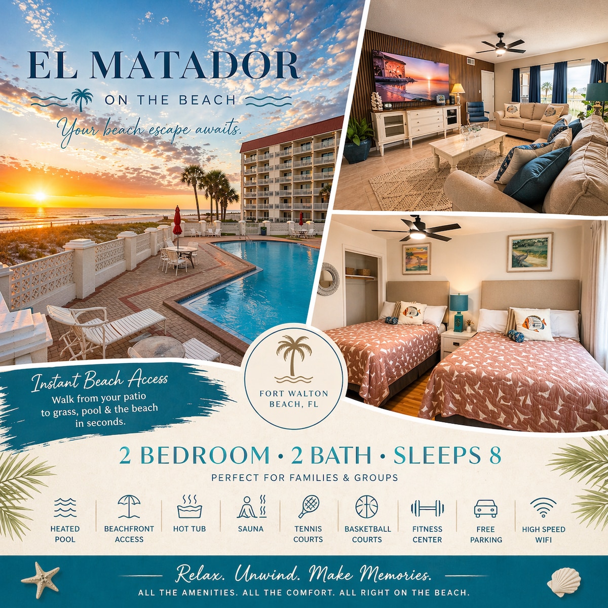 Splash, relax, repeat! Our resort has pools, a hot tub, and a splash pad for the kids. Stay active with the gym, tennis, or basketball. Walk to the beach, or drive a few minutes for quieter sand at Henderson Beach (fee) or Miramar Beach. Enjoy sunsets, beachside dinners, shopping, and charming towns along 30A like Seaside and Rosemary Beach. Destin Harbor and Sandestin are just a short drive away—perfect for family fun and evening adventures. Don’t miss a sunset dolphin cruise!