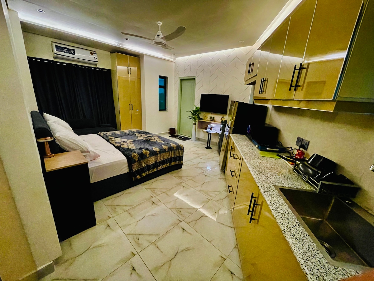 Sunlit Studio în PentaSquare DHA Faza 5 – Perfect pentru familii și călători de afaceri Această garsonieră luminoasă, modernă, cu vedere la grădină, are un pat matrimonial confortabil, chicinetă bine echipată, tot ce ai nevoie pentru o ședere relaxantă. Situat central în DHA, la câțiva pași de Cinnabon, Baskin Robbins, KFC, magazinul Imtiaz și lângă Gulberg/AirPort. Check-in independent LED 4K de 55’’ (Netflix) Wi-Fi Recepție non-stop Răcire centralizată Room service Ceai/Cafenea Acces la parc - pistă de jogging