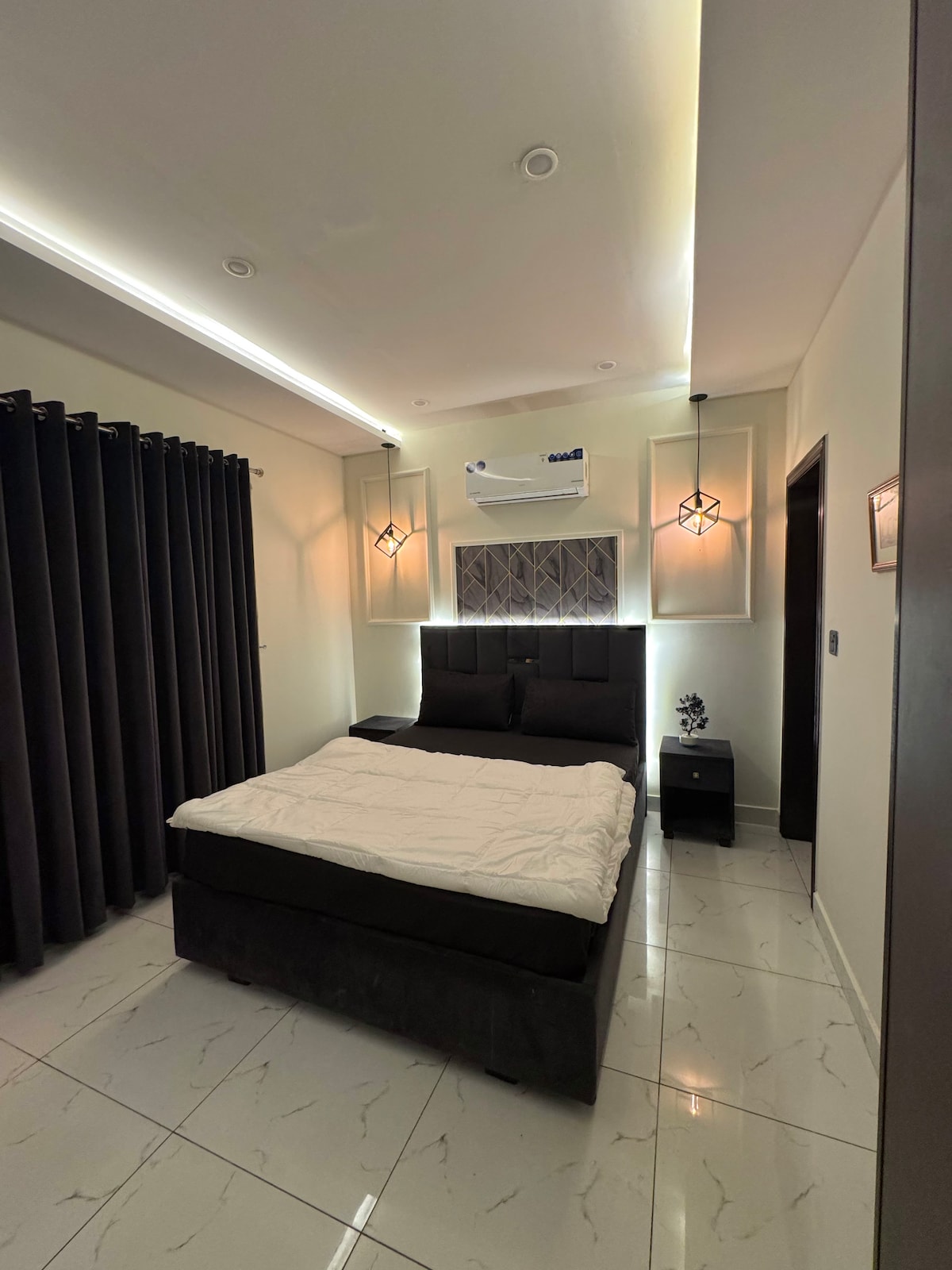 Apartamentul nostru de lux Orbit Penthouse în DHA Phase 5 este locul în care stilul urban șic se îmbină cu eleganța cerească. Gândește-te: un perete strălucitor al lunii pentru acele selfie-uri nocturne târzii și o piesă de artă îndrăzneață stivuită în dolari, care strigă „energia personajului principal” Trezește-te cu vedere la parc din leagănul tău privat de pe balconul tău privat, bucură-te de preferințe pe televizorul inteligent 4K de 50"sau gătește ceva estetic în bucătăria de designer complet încărcată. Interioarele? Abstract, elegant și făcut pentru hrană. În plus, ești chiar lângă cele mai tari locuri de luat masa din Lahore.