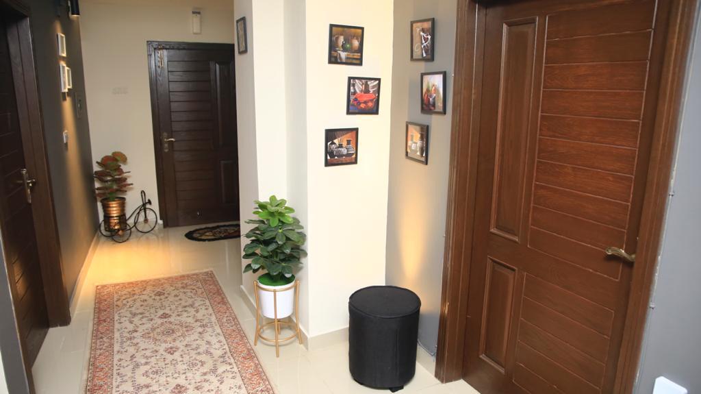 Modern 3BR upper portion in Bahria Town Phase 8, designed like a boutique hotel. Feels like home away from home with a modern touch & 5 ⭐️ hotel comfort. 🛌 Each bedroom has a king bed, private modern bathroom, inverter AC, 55” Smart TV with Netflix & other streaming apps. 💠 Enjoy high-speed Wi-Fi, complimentary breakfast on request, fully equipped kitchen, on-site laundry & 24/7 hot water. Safe, gated community with CCTV, electric fencing on exterior, 24/7 on-site helper and free parking.