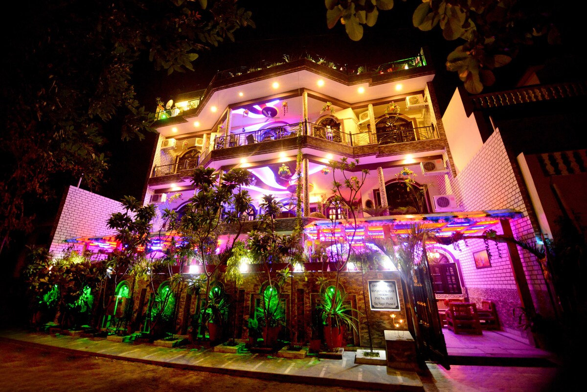 Bine ai venit în vila noastră modernă, dar inspirată din patrimoniu, cu 2 paturi confortabile, o bucătărie privată și o baie privată. Situat convenabil, la doar 2 minute de mers pe jos de aeroportul Agra și aproape de atracții majore, cum ar fi Taj Mahal, Fortul Agra și altele (aproximativ 5 km/20 de minute). Spațiul nostru este perfect pentru turiști, persoane care călătoresc în interes de afaceri, seniori, familii și chiar animale de companie. Suntem bucuroși să te ajutăm cu aranjamentele pentru taxi, mesele de casă și alte nevoi pentru a-ți face șederea lină și plăcută.