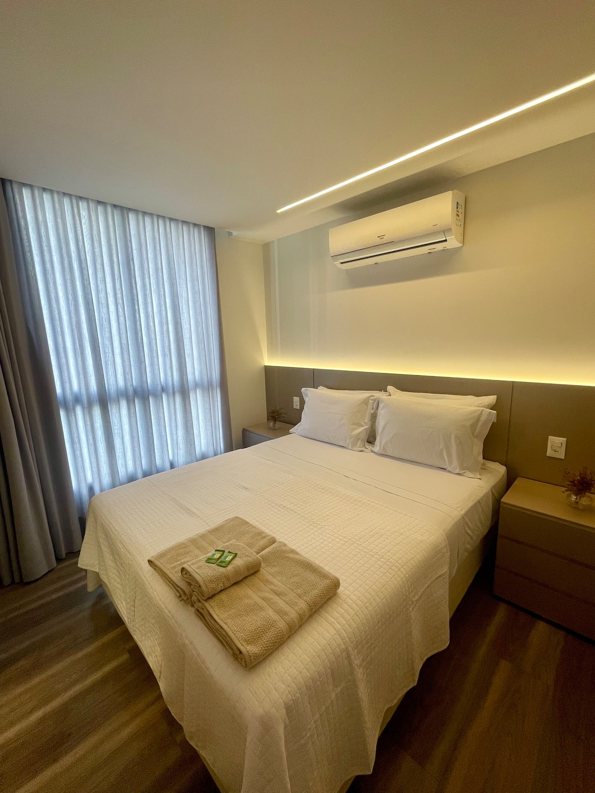 Loft de lux, 45 m2, aer condiționat, masă pentru 4 persoane și blat, bucătărie completă și utilată, mașină de spălat rufe, mașină de spălat rufe. Nespresso și alte aspecte practice. Foarte spațioasă, cu pat matrimonial, 1 canapea extensibilă și Smart TV 55'' c Wi-Fi și net. Vedere frumoasă! Zonă comună în aer liber: sală de gimnastică completă, spălătorie, piscină încălzită, jacuzzi și saună. Locație privilegiată în apropiere de Diamond, Hosp. Materdei, Piața Centrală din BH, Supernosso etc. 1 loc liber și concierge non-stop Dotări te vei simți ca acasă!
