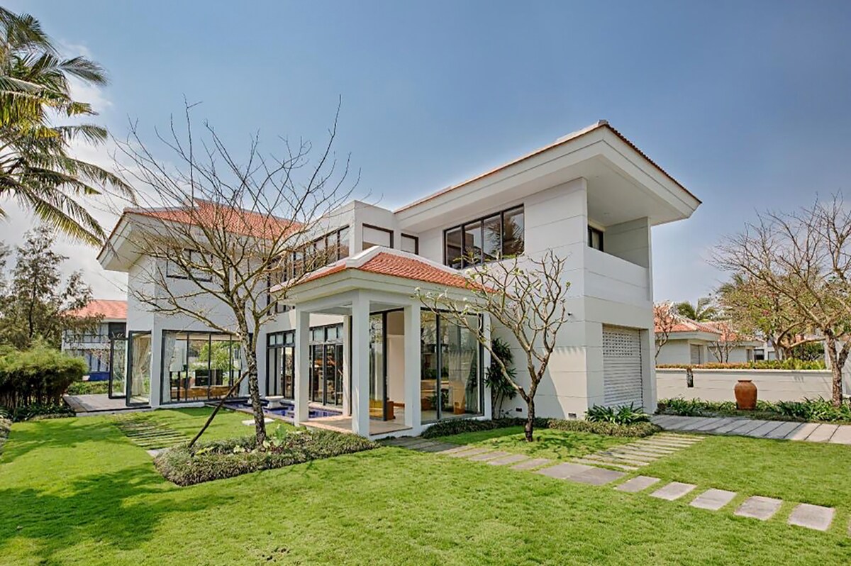 VILĂ de lux cu 4 dormitoare - Situat pe axa Da Nang Hoi An și la 2 km de plajă - Vila este proiectată cu 2 etaje cu piscină privată, 4 dormitoare extrem de mari (dulap, baie, ...) - Grădină extrem de răcoroasă la fiecare etaj, terasă extrem de răcoroasă cu vedere la râu și la terenul de golf + Piscină în aer liber, spațiu de locuit extrem de confortabil - cu ușă cu încuietoare inteligentă - cheie separată - Vila a amenajat o bucătărie cu ustensile de gătit complete și a amenajat un grătar în aer liber