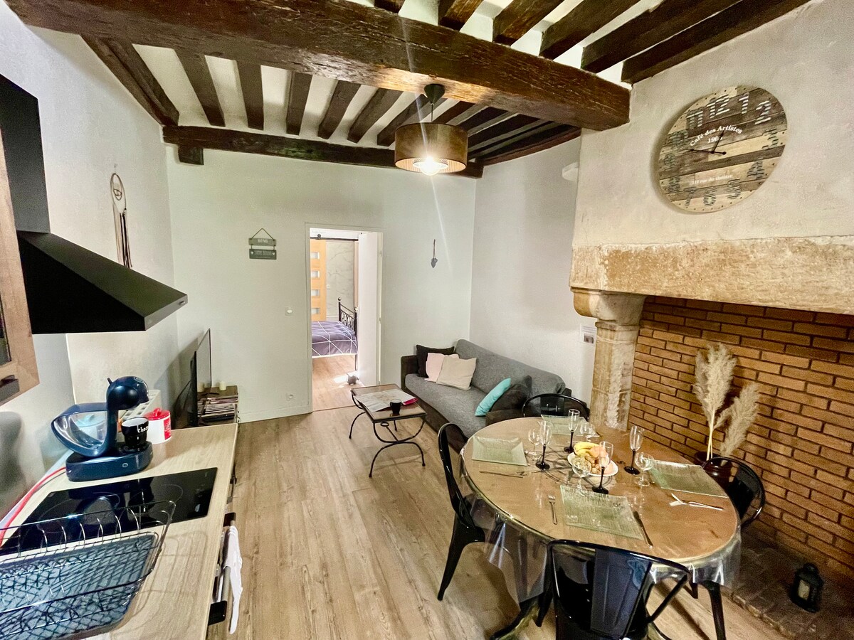 Traversat de lumină, acest apartament situat în centrul istoric vă invită să vă relaxați. Pat matrimonial, lenjerie de pat și cearșafuri de bumbac, grinzi expuse, decorațiuni îngrijite, presărate cu accente de poezie. Tonurile neutre, lemnul, piatra, pielea, soba din fontă, pianul, finețea spațiului te vor fermeca. Situat în inima cartierului vechi din Beaune, ești liniștit la 400 de metri de Hospices de Beaune. Perfect pentru doi oaspeți unici. Parcare la 5 minute de mers pe jos. Internet Fibră.