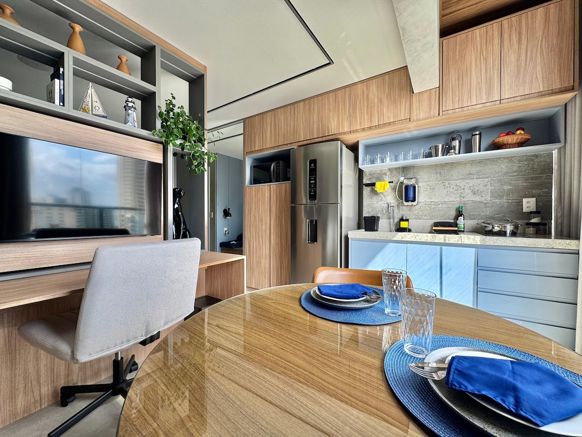 Apartamentul se află în luxosul condominiu Cloc Marina, una dintre cele mai dorite adrese din Salvador. Apartamentul are vedere uimitoare la mare și acces ușor la obiectivele turistice, oferind liniște și caracter practic. Șederea include: Bucătăria este dotată cu toate ustensilele - Așternuturi - Prosoape - Smart TV - Internet rapid Bucură-te de un apus de soare frumos într-una dintre cele mai bune locații ale orașului și bucură-te de o ședere confortabilă!