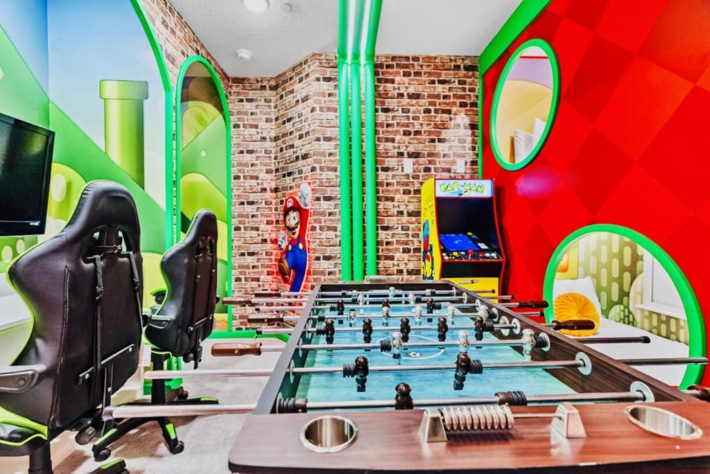 Evadează în Paradiso Grande în această casă înșiruită de lux cu 5 dormitoare și 5 băi, pentru 13 persoane! Perfectă pentru familii, dispune de camere uimitoare cu tematică Star Wars și Super Mario, o piscină privată și acces complet la complexul hotelier, care include un râu lent. Situată la câteva minute de cele mai bune parcuri de distracții din Orlando, această locuință nou-nouță este baza ta magică pentru vacanță.