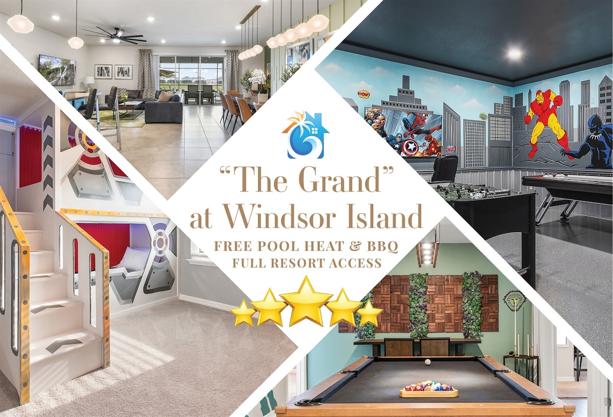 Design elegant, confort luxos și divertisment nesfârșit, cu o terasă cu piscină și bucătărie în aer liber, cu vedere la sud-vest de 2200 ft2, fără vecini în spate într-o pădure frumoasă din uimitorul complex Reunion de 3,5 metri pătrați. Vei avea propria piscină privată cu spa de preaplin, sală de cinema, biliard - sală de jocuri, 4 camere tematice: SPAȚIU EXTERIOR, SUPEREROI MARVEL cu TOBOGAN TUBULAR, ÎNGHEȚAT II, DULAP HARRY POTTER, PS5, în câteva minute până la Disney.