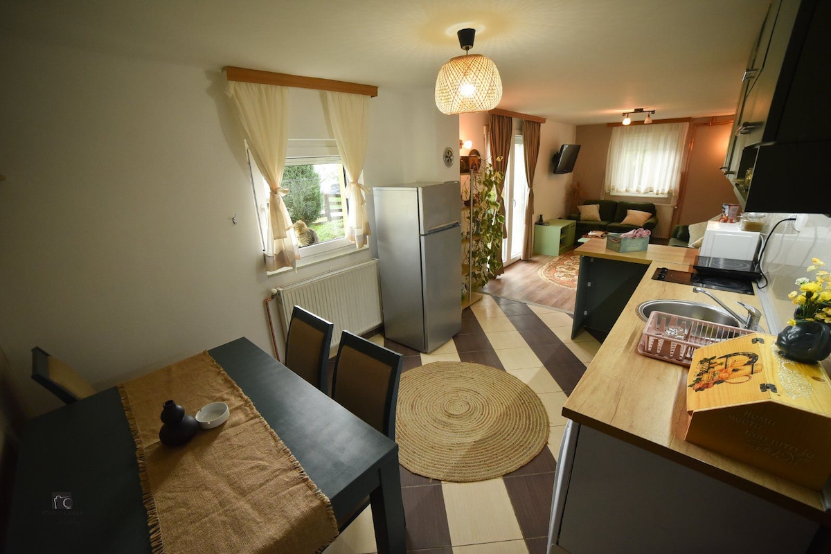 The cottage is built with natural materials, following sustainable principles, and is part of a traditional rural household, close to homemade food and farm animals. There’s no kitchen, but we offer meals from our menu that you can choose as needed. It features a TV, Wi-Fi, and a large desk for two. A special treat is an afternoon rest in the built-in tub overlooking the forest.