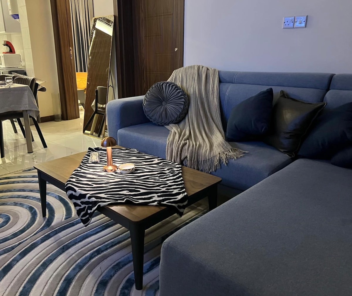 City center charm! Queen bed oasis w/ single option, heart of Mansour. Walk to shopping malls, cafes & more. AC chills, compact kitchen fuels. Modern nest near public transport. Unwind on comfy sofas, wash & stay. Your downtown Baghdad