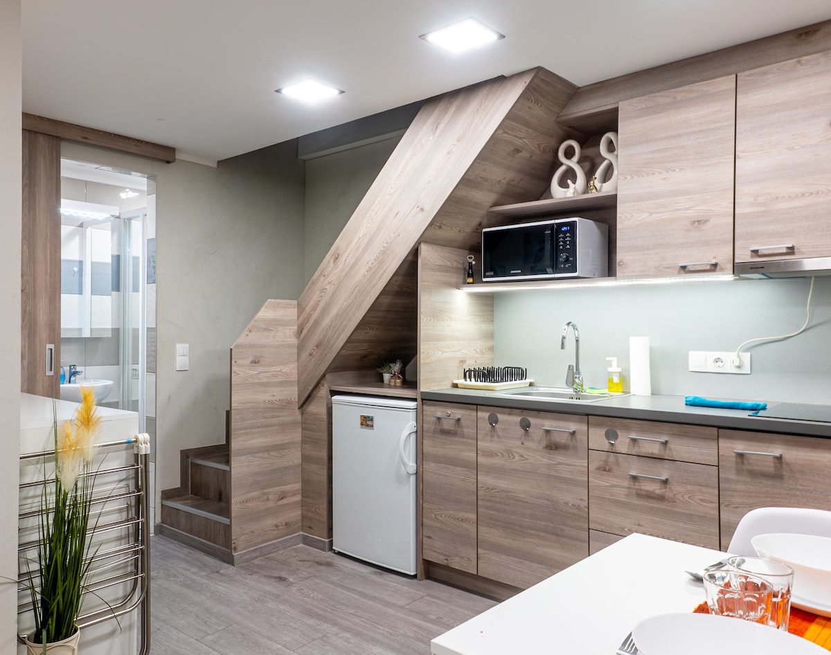 Acest apartament de la parter cu dormitor ridicat din vibrantul sector 9 din Budapesta are un dormitor și un spațiu de lucru la un nivel ridicat, oferind intimitate și separare clară de zona de living. Accesul la parter face ca intrarea cu bagaje să fie fără probleme 🚌 Legăturile excelente de transport, inclusiv tramvaie, autobuze și HÉV în Piața Boráros, plus MVM Dome și Müpa din apropiere, îl fac ideal pentru explorarea orașului, evenimente și programe culturale. 🎶 Perfect pentru cupluri sau persoane care călătoresc singure.🌆✨