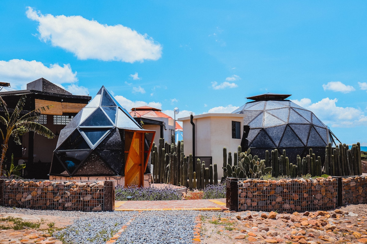 Glamping în San Miguel de Allende, spațiu sigur și ideal pentru relaxare, situat în Fraccionamiento Ecoresidencial, la 13 km de centrul istoric. Domuri de lux în mijlocul Semidesierto mexican, unde te poți bucura împreună cu partenerul sau familia de nopți înstelate, natură și momente magice. În plus, fiecare cupolă are un spațiu de terasă, un grătar și unele cu opțiunea unei căzi în aer liber. Te poți bucura de lacul natural, temazcal, vatră de foc, yoga, masaje, cu rezervare.