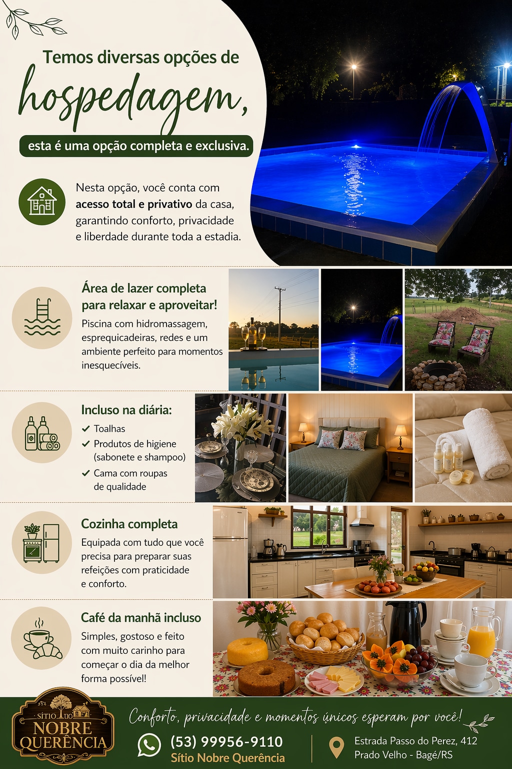 Este greu de imaginat un loc de cazare mai fermecător. Această proprietate durabilă este, de asemenea, o opțiune excelentă pentru nunți și evenimente. Situat în inima orașului Pampa gaucho, ne duce într-o călătorie în Toscana, fără a părăsi Brazilia. Înconjurat de o livadă de măslini, lacuri, zonă de agrement și contact cu natura (piscină, grătar, teren de volei, teren de fotbal, loc de joacă, grădină, prezența animalelor de fermă), living cu șemineu, fac experiența unică.