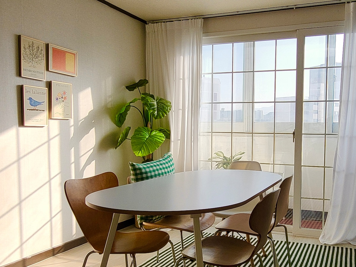 🎈10 minute de la stația Dongdaegu, o cazare însorită, excelentă pentru relaxare în liniște în timpul săptămânii 🎈Check-in disponibil în aceeași zi sau în ziua următoare/Răspuns imediat 🎈„Un loc pe care oaspeții l-au lăudat ca fiind «curat și confortabil»💫 🌿 Odihnă relaxantă, cazare confortabilă 10 minute de mers pe jos de gara Dongdaegu, Aceasta este o cazare confortabilă de 21-pyeong, cu o dispoziție vintage și un interior de plante. 🏡 Casa este la etajul 3/Nu există lift. * Odihnă caldă după un mic exercițiu, te rugăm să urci pe îndelete:) Este în regulă să dormi până târziu. Check-out-ul este 13:00 ^ ^ Animalele de companie sunt, de asemenea, permise și există un magazin de proximitate GS25 la primul etaj, deci este convenabil. Rezumatul informațiilor despre ✨ proprietate 10 minute de mers pe jos de stația Dongdaegu/3 minute de mers pe jos de stația de autobuz etajul 3 fără lift Check-out 13:00/Depozitare bagaje disponibilă Un câine este permis (în funcție de câini de talie mică) 2 camere, living spațios 21 pyeong/3 paturi queen-size Masă mare pentru 6 persoane/magazin GS25 la etajul 1 Interior cu plante pentru starea emoțională/iluminat vintage