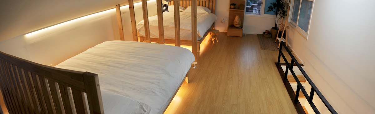 Locuința se află aproape de 8 minute de mers pe jos de stația Hoegi, unde trec linia 1 și linia Gyeongui Jungang. În apropiere se află stația Cheongnyangni, Universitatea Națională din Seul și Universitatea Națională de Studii Străine din Seul. Dacă iei linia 1 de la stația Hoegi, principalele atracții turistice din Seul, Primăria, Palatul Gyeongbukgung, Myeongdong, Cheonggyecheon, Inwangsan, Parcul Naksan și Dongdaemun DDP se află la mai puțin de 20 de minute. Muzeul Național al Coreei, care este popular în aceste zile, se află la 20 de minute de stația Hoegi folosind linia Gyeongui Jungang și este, de asemenea, ușor de utilizat în aproximativ 40 de minute până la stația Universității Hongik. Locuința este o clădire nouă și este bine întreținută.Există un frigider și o bucătărie unde poți găti, iar o mașină de spălat și un uscător sunt disponibile în spălătorie. Există 2 dormitoare și 1 dormitor în loft.E destul loc pentru bagaje. La parter există o bucătărie și un living și există 2 dormitoare cu 2 paturi matrimoniale, astfel încât 4 persoane pot locui. Există 2 paturi matrimoniale și o terasă la etajul al doilea, iar 4 persoane pot locui acolo. Mansarda este conectată la terasă și te poți bucura de priveliștea de afară și de relaxare.